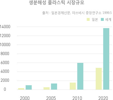 ÀϺ» ½ÃÀåÀÇ ±Ô¸ð´Â È®Á¤ÀûÀÌÁö´Â ¾ÊÁö¸¸, 2001³â¿¡ Àü³â ´ëºñ 50% ÀÌ»ó ¼ºÀåÇÏ¿© 6,000Åæ ±Ô¸ðÀÇ »ýºÐÇØ¼º ½ÃÀåÀ» Çü¼ºÇÏ¿´À¸¸ç ¸Å³â 20% ÀÌ»ó ºü¸£°Ô ½ÃÀåÀÌ È®´ëµÇ°í ÀÖ´Ù. ¶ÇÇÑ 1¸¸ Åæ ±Ô¸ð Çü¼ºÀ» ÇâÇØ È®´ë ±âÁ¶¿¡ ÀÖ´Â °ÍÀ¸·Î ÃßÁ¤µÇ°í ÀÖ´Ù. ÇöÀçÀÇ ½ÃÀå ±¸Á¶´Â ÀüºÐ°è¸¦ ±Ù°Å·Î ÇÑ ¿ÏÃæÀ縦 ´ëÇ¥·Î ÇÏ´Â °ïÆ÷ÀÚÀç ¿ëµµ 35%, PBS°è¸¦ ÁÖÀç·á·Î ÇÑ ³ó¸²¼ö»ê Åä¸ñÀÚÀç ¿ëµµ 30%, PBS °è ¹× PLA°è¸¦ ¹ÙÅÁÀ¸·Î ÇÑ À½½Ä¹° ¾²·¹±â ȸ¼ö ºÀÅõ µî Æ÷ÀåÀÚÀç ¿ëµµ 10%, PLA¸¦ ÁÖ·Î ÇÑ Åõ¸íºÀÅõ³ª Çʱⱸ·ù µîÀÇ ¹®±¸ ¹× ±× ¿Ü »ê¾÷ºÎÀÚÀç ¿ëµµ·Î 25%°¡ ÃßÁ¤µÇ°í ÀÖ´Ù.