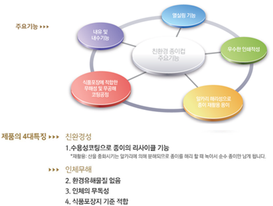 ¡Ø ³»À¯¼º, ³»¼ö¼º, »ê¼Ò Â÷´Ü¼º¹æ½À, ¿ Á¢Âø¼º, Àç Ȱ¿ë¼º, ÀÚ¿¬ºÐÇØ¼º µîÀÇ ±â´ÉÀ» ¼±ÅÃÀûÀ¸·Î ºÎ¿©ÇÏ¿© °¢Á¾ Æ÷ÀåÀçÀÇ ´ëüǰÀ¸·Î °³¹ß ¹× È®Àå »ý»ê °¡´É Available development & extended production as replacement of various packaging by assigning selectively various function(Oil proof, Water proof, Oxygen barrier, Moisture proof, Heat adhesiveness, Recycling, Bio degradation etc.)