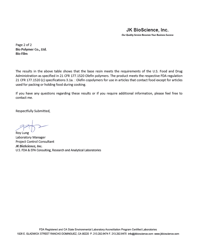 Summary of Test Results for Sample: BIO FILM CLIENT: BIO POLYMER CO., LTD. #305 Business Incubator, The Catholic University of Korea, Gibongro 43, Wonmigu, Bucheon City, Gyeonggido, South Korea DATE ANALYZED: 12/21/2016 PROJECT CONT. PERSON: Young - Sun You SAMPLE I.D.: BIO Film MATRIX: Solid |