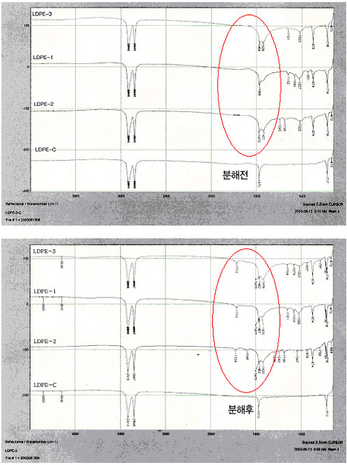 Àڿܼ±, ¿ µîÀÇ ¿ÜºÎÀڱؿ¡ ³ëÃâ½ÃŰÁö ¾ÊÀº Çʸ§¿¡¼´Â 1710 ~ 1750cm-1ÀÇ Ä«¸£º¸´Ò(carbonyl)µÊÀ» È®ÀÎÇÏ¿´´Ù. ¼ö½Ê¸¸ÀÇ °íºÐÀÚ·®ÀÇ Æú¸®¸Ó´Â ºÐÇØ ÈÄÀÇ °æ¿ì 10,000 ~ 20,000Á¤µµ·Î °¨¼ÒÇÏ¿´À¸¸ç, ¿ ¹× UV¿¡ ÀÇÇÑ ºÐÇØÀÇ °æ¿ì´Â ºÐÀÚ·®ÀÌ 7,800 ~ 8,000À¸·Î °¨¼ÒµÇ¾ú´Ù. ÀúºÐÀÚÈ µÈ Çʸ§Àº ¹Ì»ý¹°¿¡ ÀÇÇÏ¿© ºÐÇØµÉ ¼ö ÀÖÀ¸¸ç, ÀÌ´Â ¹ÙÀÌ¿À¸Å½º Çʸ§ÀÇ »ýºÐÇØ Ư¼ºÀ» È®ÀνÃÄÑÁÖ´Â ½ÇÇè°á°úÀÌ´Ù.
